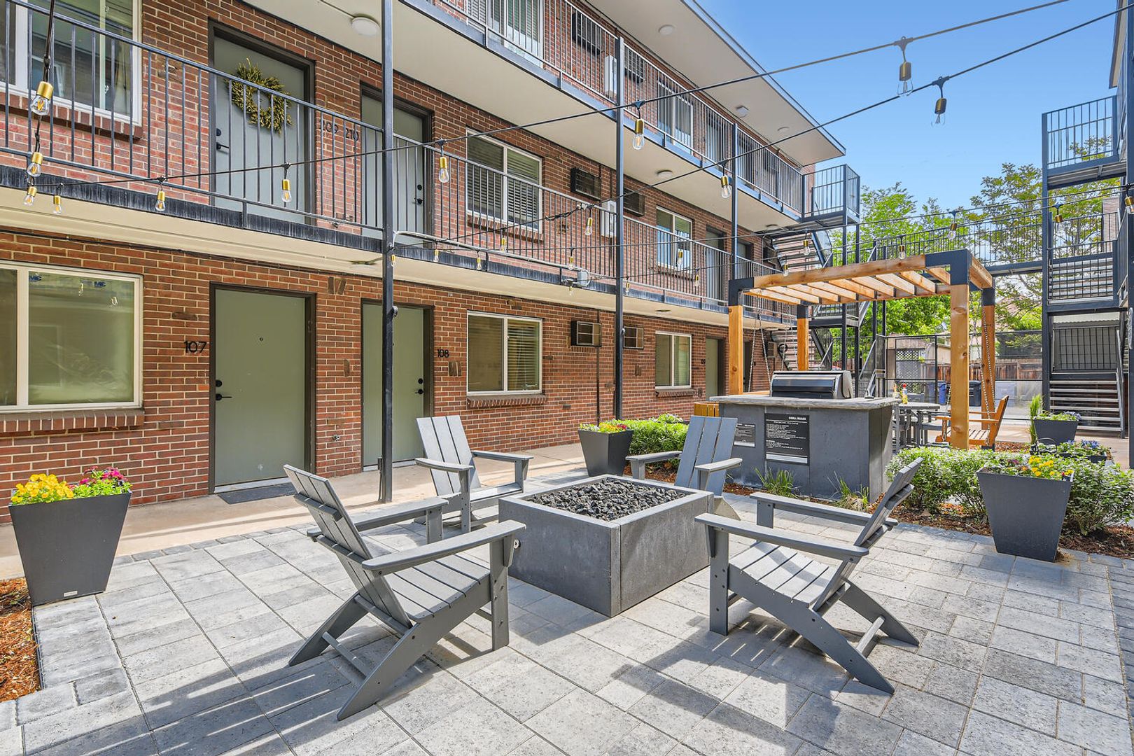 Fabulous community courtyard space with beautiful lighting, seating, grill, and fire pit. The building has on-site laundry for convenience. Enjoy urban living in the heart of Denver, just steps to tons of shopping and dining, parks, with easy access to I-25 and downtown Denver!